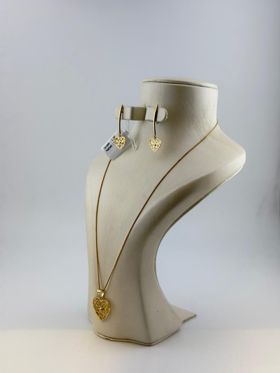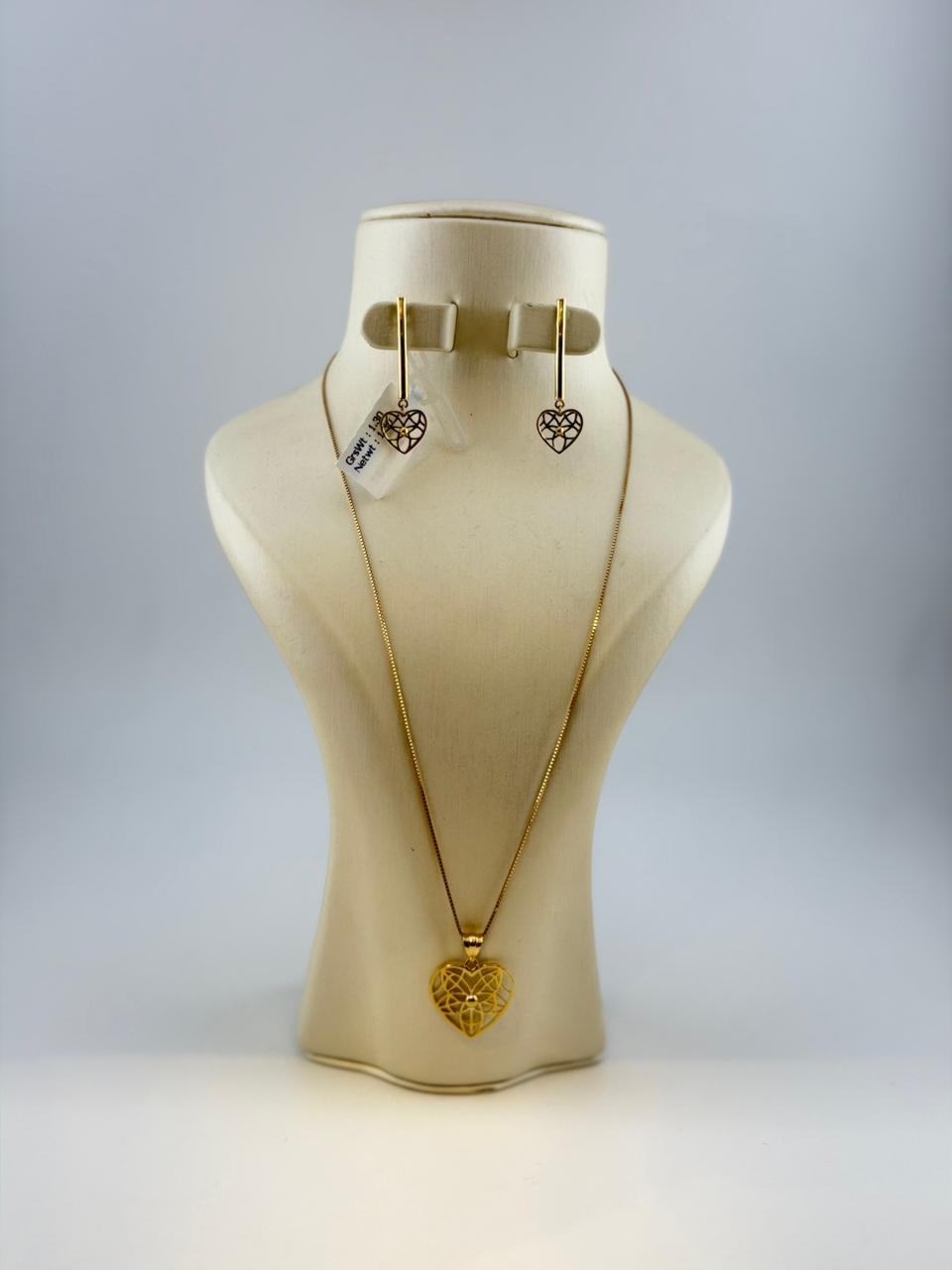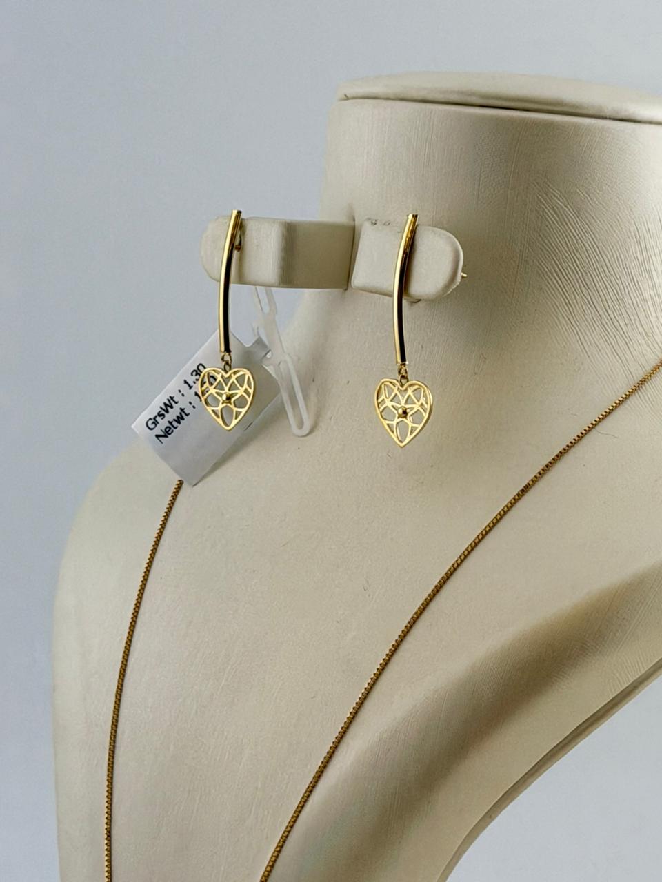 This elegant 18K gold set includes a sleek chain, refined pendant, and classic stud earrings, crafted in 75% pure gold with a polished finish. Total weight: 3.78 grams (chain ~1.42g, pendant ~1.060g, studs ~1.30g). Perfect for daily wear or gifting.