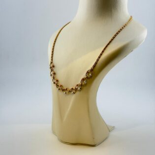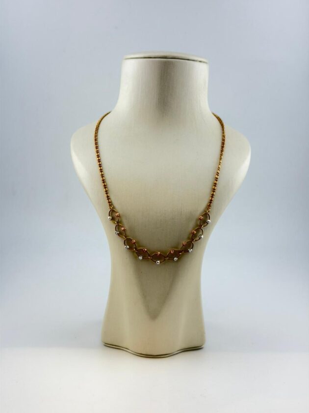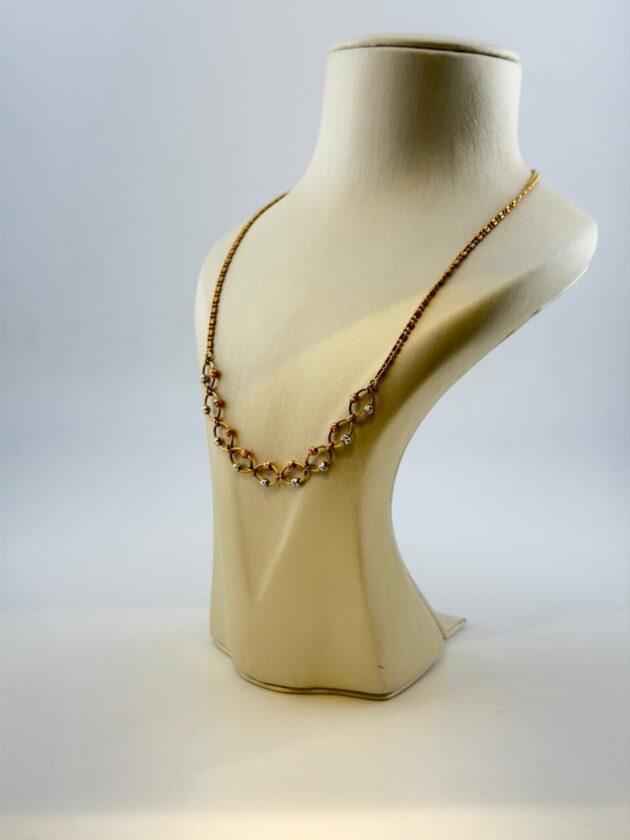 Crafted from pure 18-karat gold, this piece showcases a delicate yet durable design that drapes gracefully along the neckline — perfect for both daily wear and special occasions.