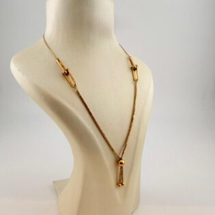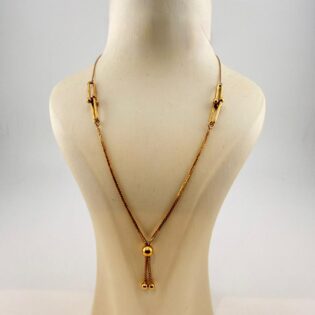 Crafted from pure 18-karat gold, this piece showcases a delicate yet durable design that drapes gracefully along the neckline — perfect for both daily wear and special occasions.